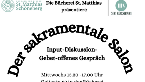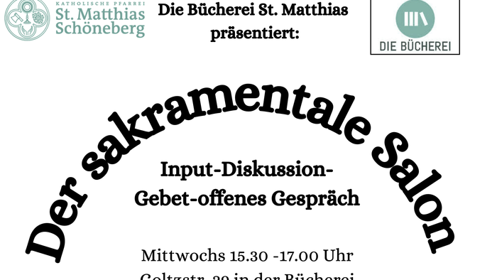 Was bedeuten Taufe, Eucharistie oder Krankensalbung für das Leben der Gläubigen heute? Die Bücherei der katholischen Pfarrei St. Matthias Schöneberg greift diese Frage in ihrer bewährten Veranstaltungsreihe „Der offene Salon" auf: Unter dem Titel „Der sakramentale Salon" werden an sieben Mittwochnachmittagen die sieben Sakramente vorgestellt und gemeinsam diskutiert. Jeder Termin verbindet einen thematischen Input mit Diskussion, Gebet und offenem Gespräch.