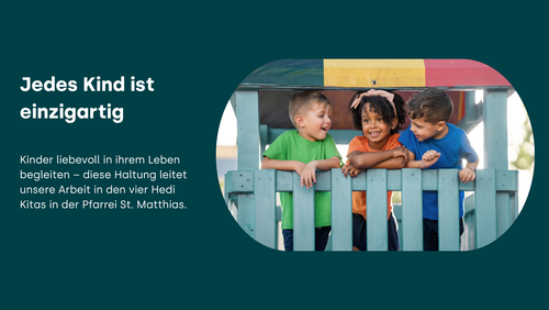 Unsere vier Hedi Kitas in der Pfarrei St. Matthias bieten Kindern lebendige Orte, um sich zu entfalten. Gleichzeitig haben wir als Träger Verantwortung für über 70 weitere Kitas in Berlin, Brandenburg und Vorpommern. Unsere Einrichtungen sind so einzigartig wie jedes Kind, das wir begleiten dürfen. In all dieser Vielfalt stärken wir, was uns verbindet: Kinder liebevoll, achtsam und verlässlich in ihrer Entwicklung zu unterstützen.