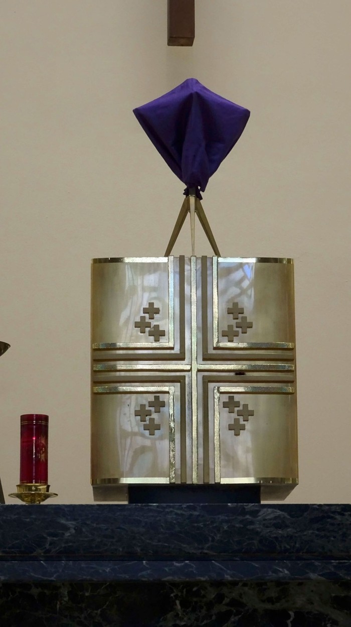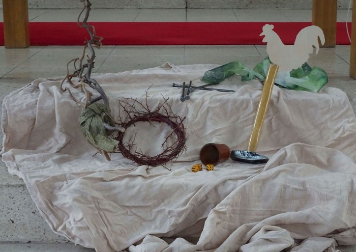 Palmsonntag feierten wir die „Palmenweihe“ wie gewohnt im Pfarrgarten neben der Kirche. Vikar Hofmann segnete die Sträuße, die Martina am Vortag gebunden hatte. Trotz kleiner Gemeinde, es war Ferienanfang, zogen wir mit kräftigem Gesang über den Parkplatz zum Haupteingang und dann in die Kirche. Das verhüllte Kreuz auf dem Tabernakel stand im Gegensatz zum geschmückten Prozessionskreuz (s. Titelbild).