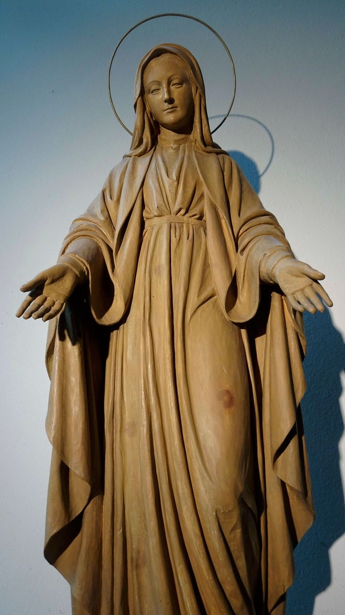 Wie angekündigt, soll der Blick nach der Rückkehr in die Kirche einmal etwas genauer auf unsere Marienstatue auf der linken Seite gehen.