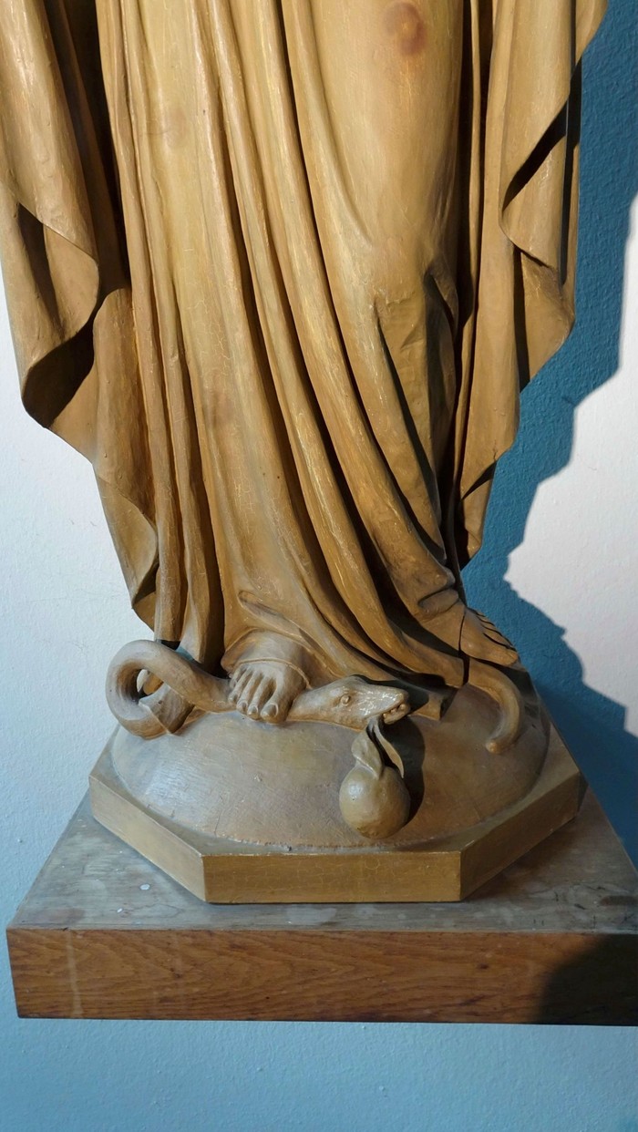 Maria wird hier nicht als Mutter mit Kind gezeigt, sondern als starke Frau, die das Böse überwindet und den Menschen ihre Hilfe mit den geöffneten Händen anbietet. Gleichzeitig steht sie auf der Schlange, die mit einem Apfel im Maul, den Bezug zu Eva im Paradies herstellt.